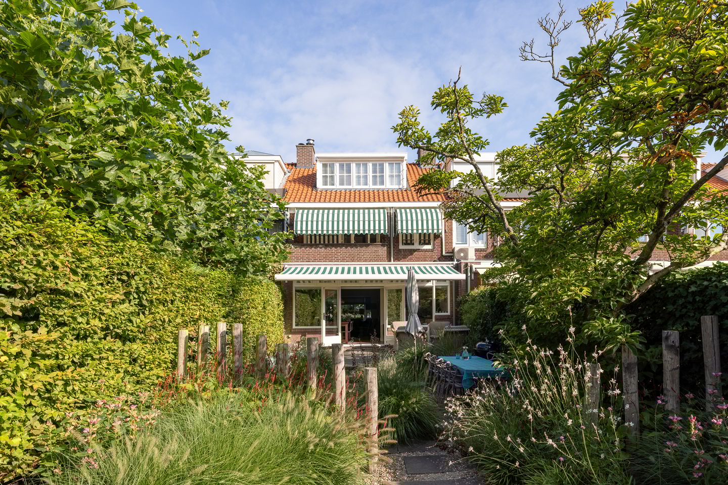 De achtertuin, circa 17 meter diep, is onder architectuur aangelegd en optimaal gesitueerd op het zuiden. Het ontwerp bestaat uit een combinatie van 2 terrassen, speelse, organische borders en als eye catcher een luxe houten overkapping met loungehoek. Daarnaast beschikt de tuin over een berging en een afgesloten achterom.