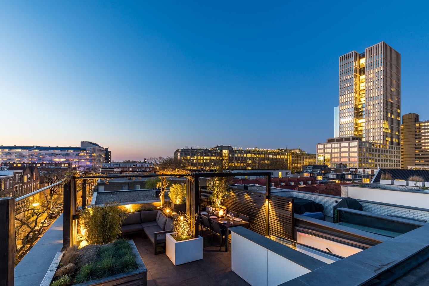 roof terrace: approx. 34m2, landscaped under architecture, very tastefully and luxuriously finished and furnished with a zone for lounging, a zone for BBQing and a zone for dining with the city at your feet. This is where the drinks and dinner parties are given that will be talked about for a long time.