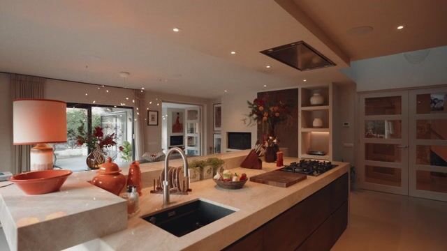 Vanuit de hal loop je de riante woonkeuken met fraai kookeiland met marmeren afwerking binnen, die luxe is afgewerkt en beschikt over hoogwaardige apparatuur, waaronder een Quooker, 2 vaatwassers, 2 koel vries combinaties, een magnetron, een oven en een groot gasfornuis. De keuken biedt plek voor een grote eettafel en heeft een sfeervolle open haard, waardoor het een heerlijke plek is om samen te komen. De grote schuifpui sluit naadloos aan op de achtertuin.