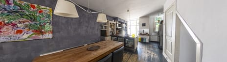 Grote, royale woon-/leefkeuken van ca. 50 m2. Door de openslaande deuren aan de voorzijde is het heerlijk licht en is deze ruimte makkelijk vanaf de straatkant toegankelijk.