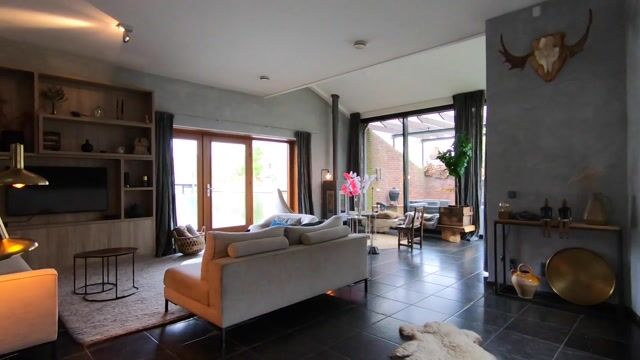 Entree, royale hal met een vaste op maat gemaakte garderobekast, meterkast en een modern toilet met fontein. Openslaande deuren in staal uitgevoerd leiden naar de woon-/eetkamer met een verlaagde zitkamer van ca. 45 m², een plafondhoogte van ca. 3 meter, een sfeervolle houtkachel, een Belgisch hardstenen vloer en een schuifpui naar de tuin. De eetkamer van ca. 30 m² grenst aan de luxe, tijdloze en ruime halfopen moderne keuken met Belgisch hardstenen vloer. Deze is voorzien van een Quooker, vaatwasser, afzuigkap, inductie kookplaat, een combi-ovens/magnetron, een stoomoven, een geïntegreerde koffieautomaat, een koelkast en een vriezer. De voormalige garage is omgebouwd tot een multifunctionele kamer, momenteel in gebruik als studeer- en t.v.-kamer.