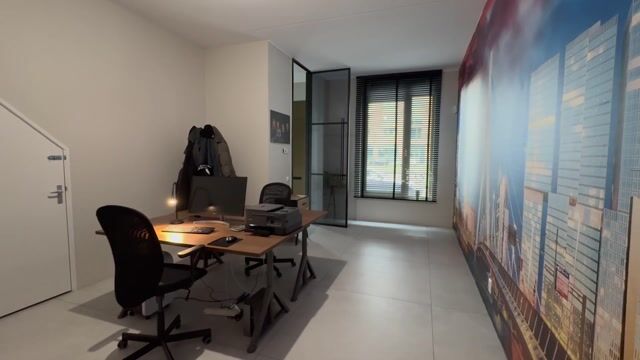 De entree van de woning bevindt zich aan de Laan op Zuid. Vanuit de hal heb je toegang tot een ruime werkkamer. Ideaal voor kantoor aan huis met een toilet en een achterdeur die leidt naar de afgesloten parkeergarage met een externe berging. De parkeergarage deel je met twee buren, en alleen jullie hebben toegang tot de parkeerplaatsen. Via de hal leidt de trap met opmaat gemaakte stalendeur naar de eerste verdieping.