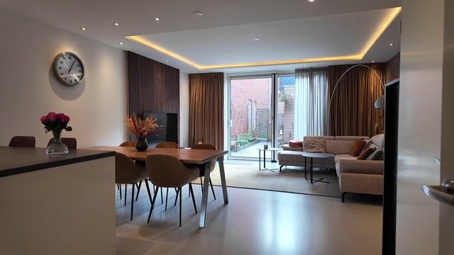 Aan de voorzijde van de woning bevindt zich de moderne open keuken, uitgevoerd met een stijlvol schiereiland dat ook nog eens extra werk en zitruimte biedt. De keuken is voorzien van luxe inbouwapparatuur, waaronder een vaatwasser, inductiekookplaat met afzuiging, koelkast en oven. Door de open opstelling staat de keuken in directe verbinding met de woonkamer, wat zorgt voor een ruimtelijk en gezellig geheel. De gehele begane grond is voorzien van vloerverwarming.