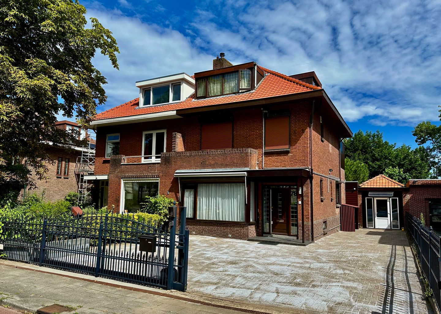 - Omheinde oprit met elektrisch hek en parkeergelegenheid voor meerdere auto's.