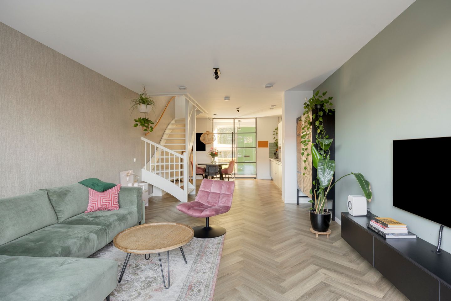 Via stijlvolle industriële deuren bereikt u vanuit de hal de uitgebouwde leefruimte. Deze sfeervolle ruimte is ingedeeld met aan de voorzijde het eetgedeelte, in het midden de keuken en aan de achterzijde het gezellige loungegedeelte.