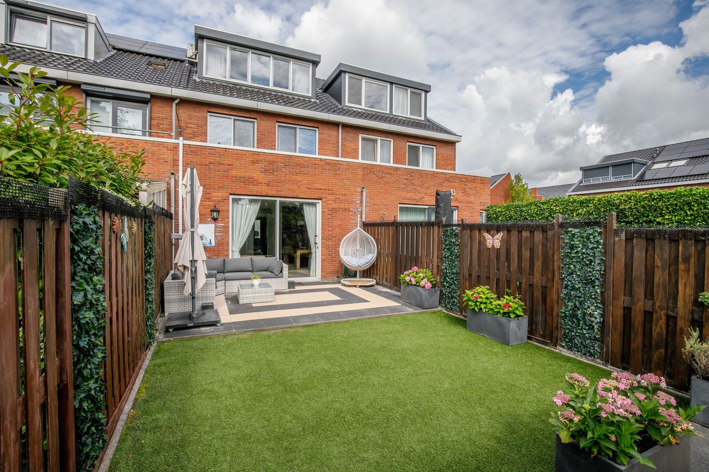 Via de schuifpui in de woonkamer bereik je de zonnige achtertuin van bijna 13 meter diep. De tuin is onderhoudsvriendelijk aangelegd met kunstgras, beschikt over een berging en een achterom.