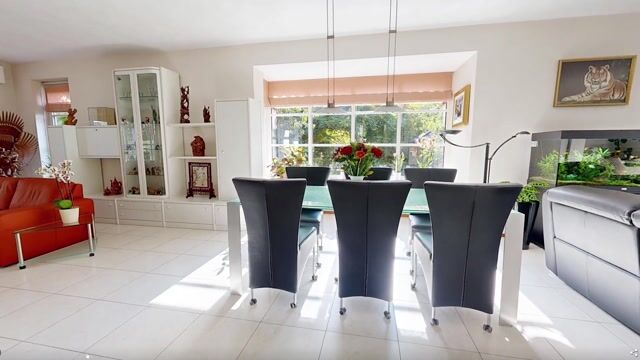 De royale woonkamer is een heerlijke, lichte leefruimte met een sfeervolle erker en grote raampartijen rondom. Vanuit elke hoek kijk je uit over groen en water, wat zorgt voor een rustgevende sfeer. De vloer is voorzien van lichte vloertegels met vloerverwarming en de afwerking is tot in de puntjes verzorgd. Er zijn openslaande deuren wat een fijne verbinding geeft met de tuin.