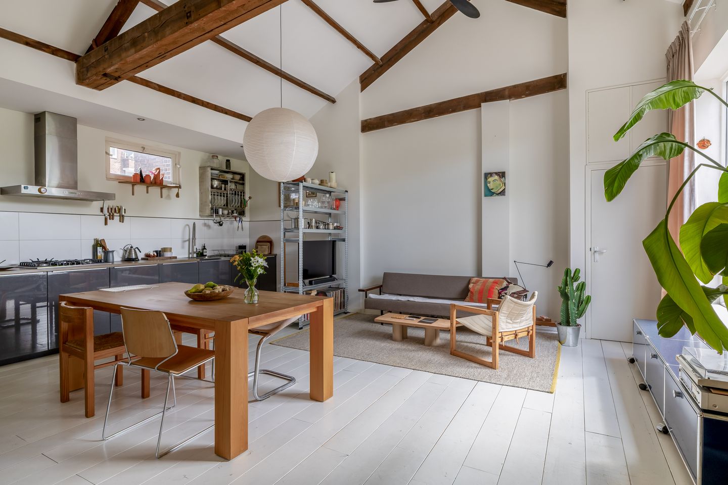 Hoge plafonds en zichtbare houten balken.