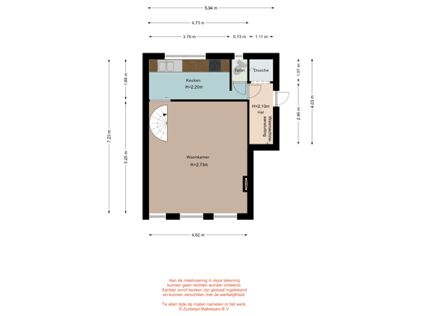 * Woningentree aan de zijkant van de woning; hal en wasmachine-aansluiting; doucheruimte en toegang tot de keukenruimte.