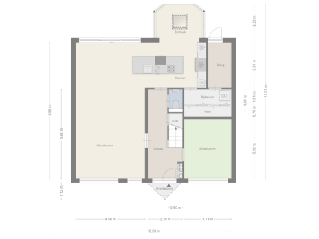 De ruime woonkamer van ruim 40 m² is voorzien van een airconditioning en een mooie eikenhouten parketvloer die direct in het oog springt en zorgt voor een warme sfeer. Via de woonkamer biedt een schuifpui toegang tot de tuin, waardoor binnen en buiten naadloos in elkaar overlopen.