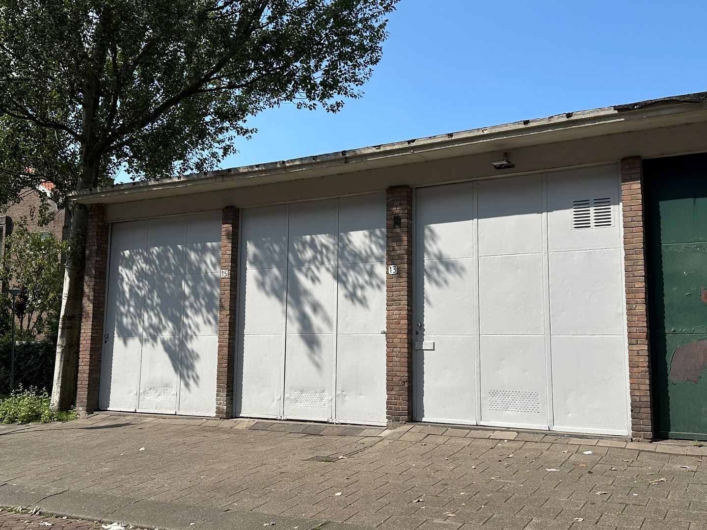De garage is voorzien van een driedelige houten schuifdeur (zijdelingse sectionaaldeur) met een hoogte van circa 3,30 meter. Er is een elektra-aansluiting en er is een wateraansluiting.