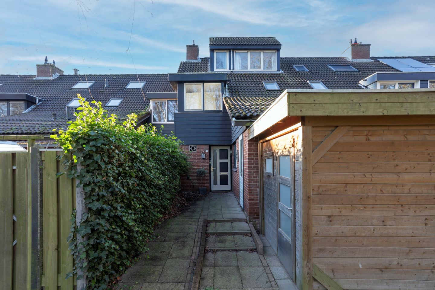 De achtertuin is ca. 5.00m*5.00m groot, is gelegen op het zuidwesten en rondom voorzien van een houten schutting met gaaswerk, welke aan de linker- en rechterkant jaardoor groen is door de begroeide klimop en aan de voorzijde bladverliezende begroeiing heeft. De tuin heeft een achterom, is betegeld en er is voldoende ruimte voor een leuke tuinset.