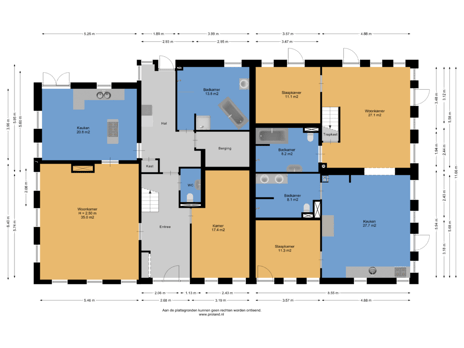 Via voornoemde hal is tevens een trap naar de verdieping te bereiken, een toiletruimte, een kamer/kantoorruimte en een bijkeuken met ruime provisiekast met tuindeur en aansluitend een berging met een ruime badkamer, voorzien van inloopdouche, bubbelbad en wastafelmeubel.