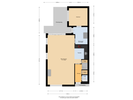 De aan de bijkeuken gebouwde kantoorruimte heeft eveneens een plavuizen vloer, met vloerverwarming, en heeft onder andere kunststof kozijnen.