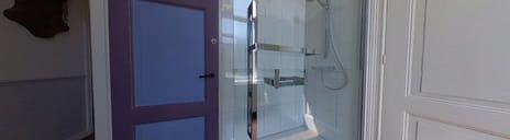 De badkamer is royaal en ingericht met een inloopdouche, een wastafel en een praktische vaste kast.