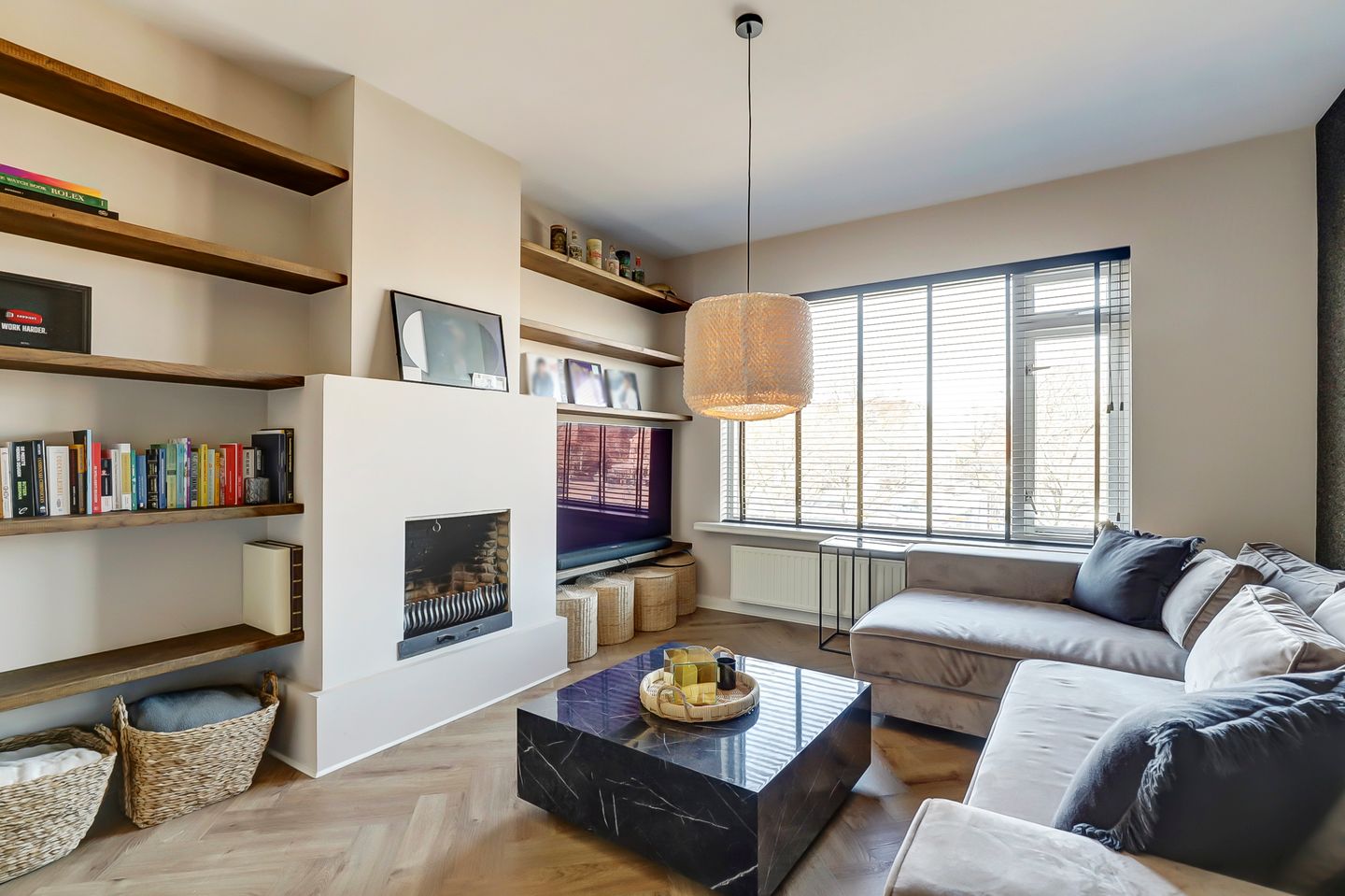 De gehele verdieping is afgewerkt met een elegante visgraat laminaatvloer en strak gestuukte wanden en plafonds, wat zorgt voor een moderne en hoogwaardige uitstraling