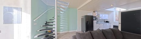 Een wenteltrap in de woonkamer leidt naar de eerste verdieping.