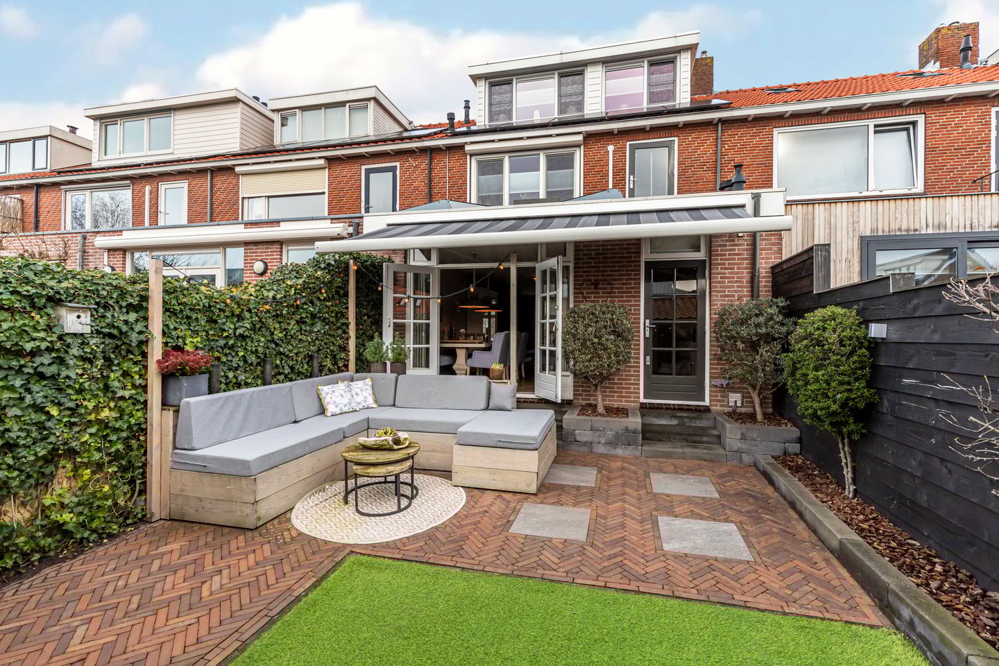 Achterin bevinden zich de berging en de overkapping, een fijne plek om tot in de avond buiten te zitten. Via de achterom is de tuin praktisch bereikbaar.