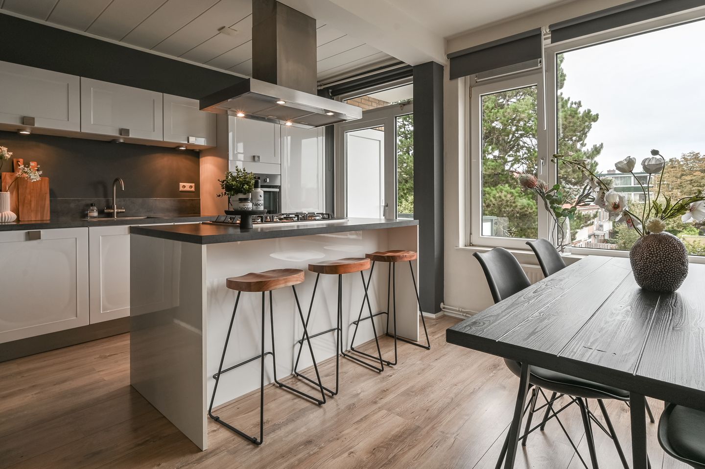 2e etage: entree; ruime hal; meterkast; modern toilet; ruimte voor wasmachine/droger; lichte woonkamer met zijraam en leuk vrij uitzicht; woonkeuken met moderne opstelling voorzien van kookeiland, 5 -pits gaskookplaat met wokbrander, afzuigkap, koelkast, 3 laden vriezer en combi oven-magnetron; toegang tot balkon met berg/CV-kast. Masterbedroom aan de achterzijde en 2e slaapkamer aan de voorzijde.