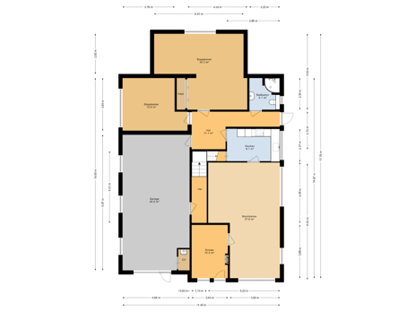 Begane grond: De woning wordt betreden via de entree met daarin de meterkast. . De woonkamer beschikt over grote ramen met een natuurlijke lichtinval en een schuifpui naar de tuin op het zuiden. Aangrenzend is de dichte keuken te vinden met een oven, vaatwasser, inductiekookplaat en een koelkast. Aan de achterzijde van de woning zijn twee slaapkamers van respectievelijke ca. 16 m2 en ca. 30 m2 gelegen. De grootste slaapkamer heeft een schuifpui waarmee de achtertuin bereikt kan worden. De badkamer beschikt over een toilet, een wastafel en een douchehoek. De inpandige garage van ca. 47 m2 beschikt over voldoende ruimte voor een auto en opslag van spullen. Vanuit de garage kom je in de hal met de trap naar de eerste verdieping.