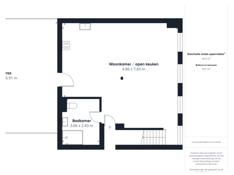 Via de gezamenlijke entree aan de voorzijde van het gebouw kom je binnen in een verzorgde hal. Een trap leidt naar het privé-appartement op de eerste verdieping. Hier opent zich de lichte woonkamer met een moderne open keuken, een ruimte die uitnodigt tot samenzijn en koken. De keuken is voorzien van diverse hoogwaardige inbouwapparatuur, waardoor koken een plezier wordt. De woonkamer biedt bovendien direct toegang tot het ruime dakterras, dat dankzij zijn ligging en afwerking een heerlijke buitenplek vormt om te genieten van zon en frisse lucht. Op deze verdieping is ook een luxe badkamer aanwezig, voorzien van een inloopdouche, een wastafel met meubel en een toilet.