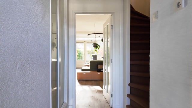 Ruime en lichte woonkamer met praktische trapkast. Vanuit de woonkamer heeft u middels openslaande deuren toegang tot de achtertuin. De woonkamer, gang en toilet zijn voorzien van een pvc vloer met comfortabele vloerverwarming.