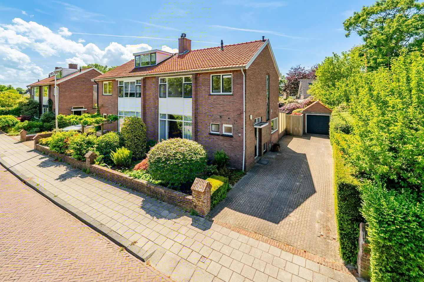 De grote gezellige groene tuin is bereikbaar vanuit de woonkamer, de keuken, via de zij ingang of vanuit de garage. De tuin heeft een groot deels overdekt terras tegen de woning aan, veel beplanting en een mooie vijver met vissen. De garage heeft aan de achterzijde een berging gedeelte en er is een overkapping geplaatst die grenst aan de garage.