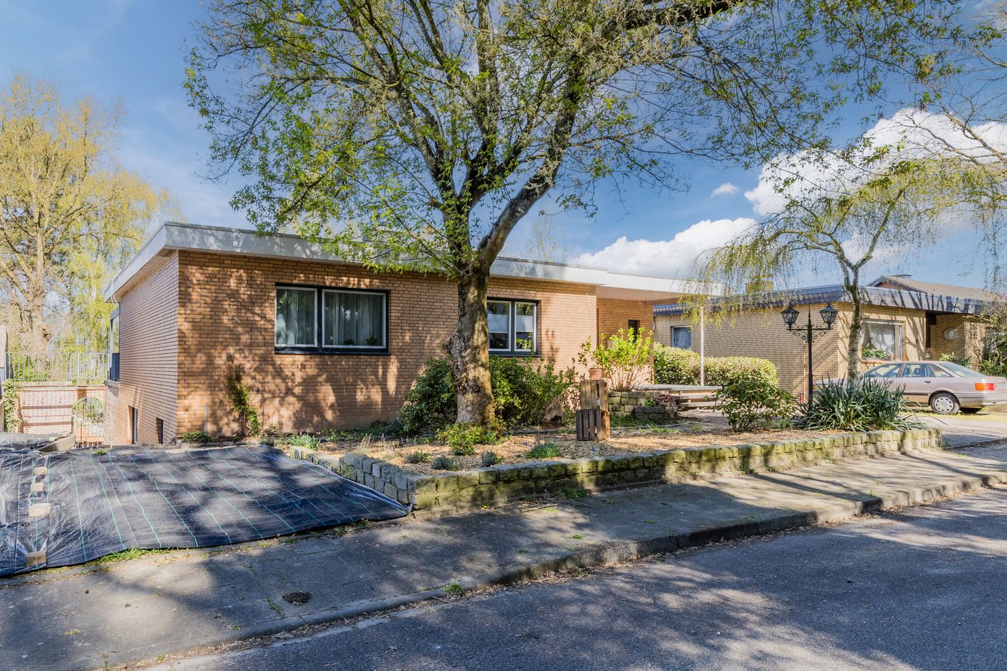 Voortuin met perkjes en bomen.