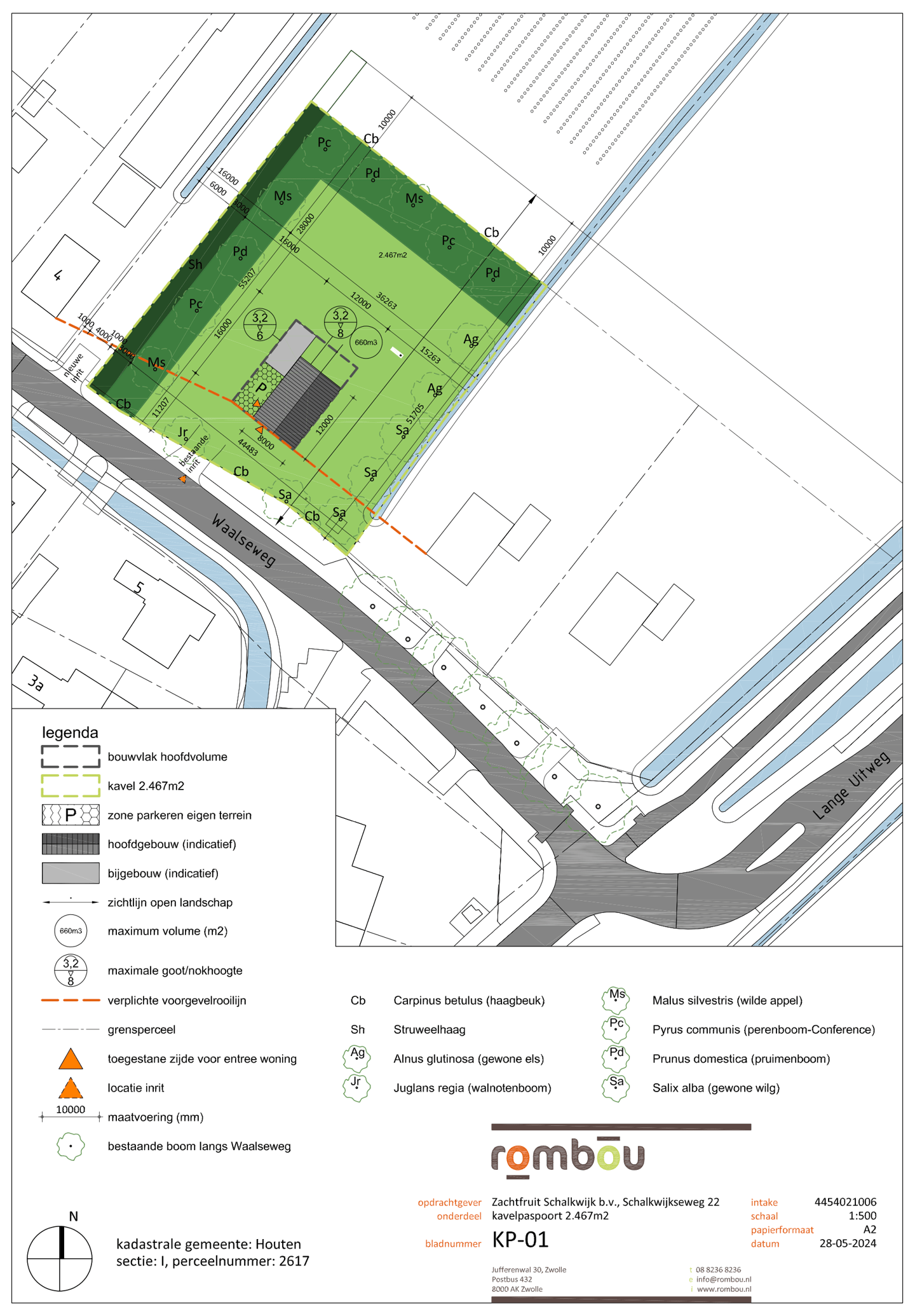 Voor de kavel is een inrichtingsplan gemaakt. Aan de noord en westzijde van de kavel wordt door en voor rekening van de verkoper een strook met hoogstamfruitbomen en struweelhagen aangelegd. Langs de watergang die de kavel I en II scheidt worden knotwilgen geplant en op de grenzen van de kavel worden beukenhagen geplant. Zie schetsontwerp en beplantingsplan. Deze stroken maken onderdeel uit van de bouwkavel en voor de koper geldt een onderhoudsplicht en een instandhoudingsplicht.