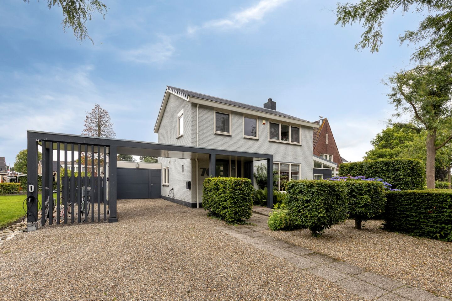 De voortuin is onderhoudsvriendelijk aangelegd met siergrind en een gevarieerde beplanting. Langs de woning loopt een ruime oprit met parkeergelegenheid voor meerdere auto's op eigen terrein. Aan de voorzijde is tevens een carport met open fietsenstalling gerealiseerd. De ruime stenen garage ca. 20,7m² groot met aangebouwde berging ca. 12,6m² groot biedt voldoende ruimte voor het stallen van een auto, fietsen en diverse tuingereedschappen.