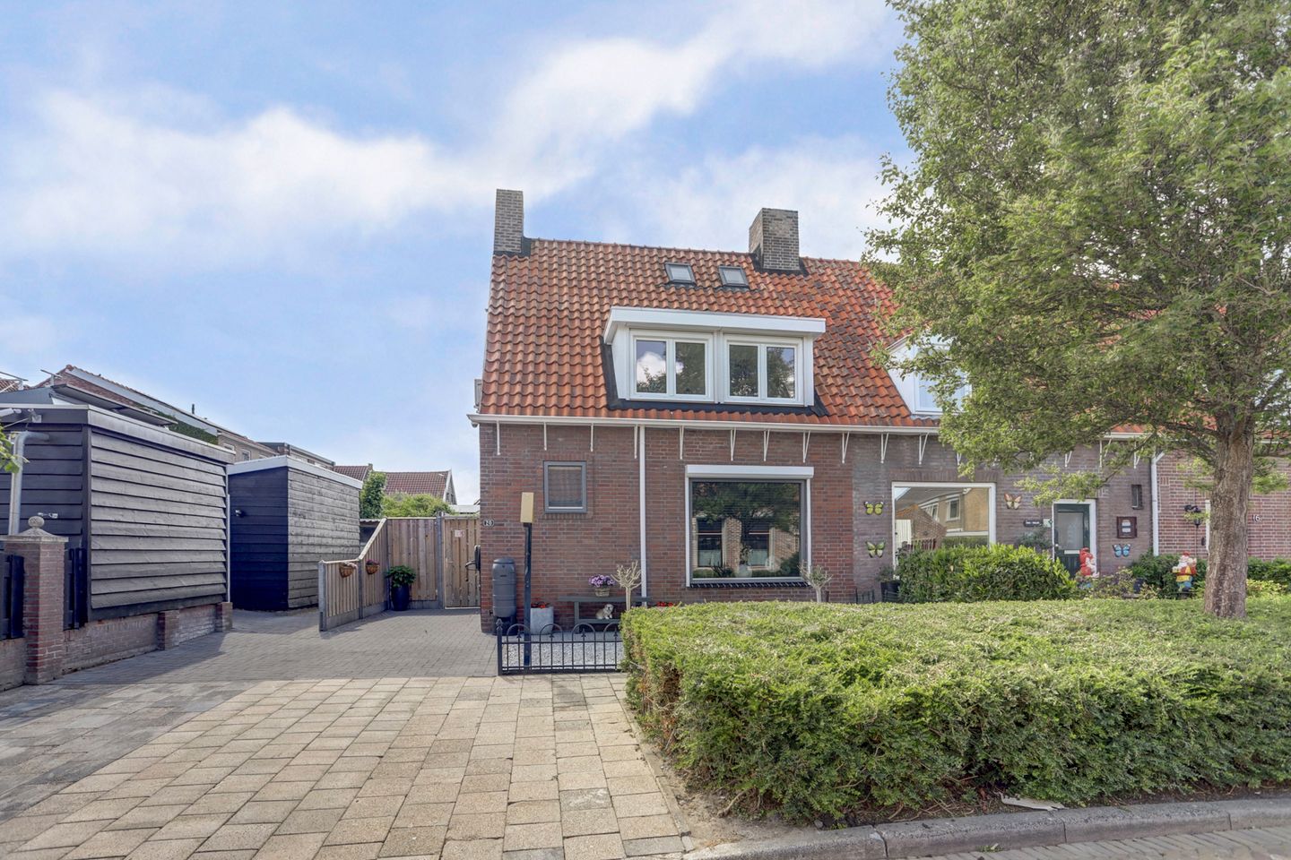 Aan de voorzijde is er ruimte om te parkeren op eigen terrein en is de voortuin netjes aangelegd met een lage haag.