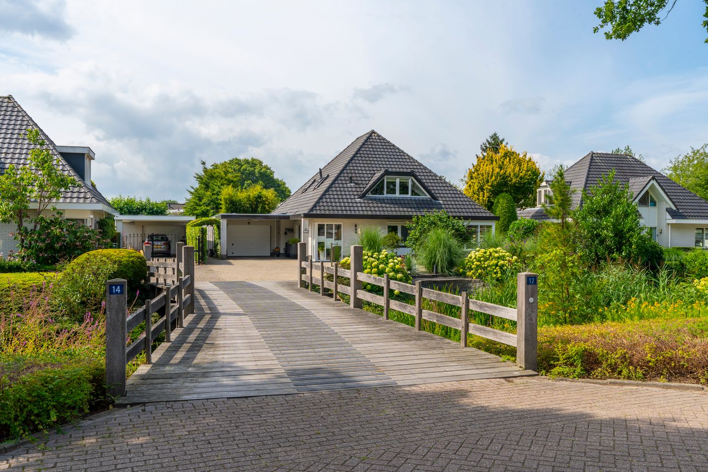 Wij nemen u graag mee door de woning. We beginnen buiten, waar u via de gemeenschappelijke brug met de buren zicht krijgt op een domein dat aanvoelt als een eigen eiland. Hier bevinden zich een royale parkeerplaats, een carport en de toegang tot de garage. Dit familiehuis is tot in detail verzorgd en straalt warmte en sfeer uit.