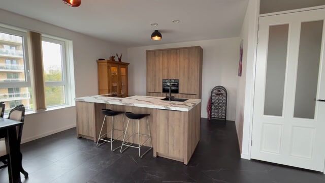 De woonkamer van circa 38 m² is heerlijk licht door de vele ramen en biedt een prettig uitzicht over de omgeving. De ruimte is afgewerkt met een fraaie pvc-vloer en voorzien van vloerverwarming/-koeling. Via de woonkamer is er middels openslaande deuren toegang tot het ruime balkon met elektrische zonwering. Het balkon is gelegen op het westen, met volop middag- en avondzon.