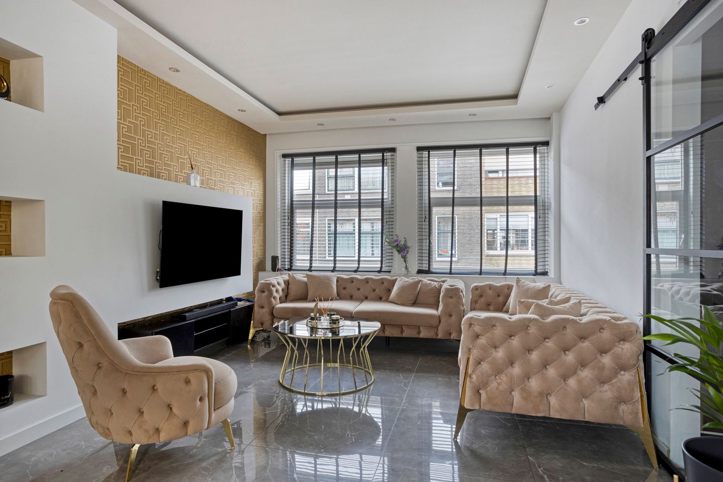 1e woonlaag: overloop/gang met ruim toilet en toegang tot een slaapkamer en de woonkamer (stalen deur); grote slaapkamer van 11 m2, met toegang tot een separate praktische ruimte met aansluiting wasmachine; grote doorzonwoonkamer met fraaie strakke afwerking, ruime zithoek aan de voorzijde en aan de achterzijde de eethoek een kozijn met schuifpui naar het balkon; halfopen keuken met separate deur naar het balkon en een hoekopstelling v.v. natuurstenen aanrechtblad en inbouwapparatuur: vaatwasmachine, oven, inductie kookplaat, vlakschermafzuigkap en magnetron, alsmede een losse koelkast met vriesvak; woonkamer en keuken zijn samen 37 m2; de 1e woonlaag heeft een balkon aan de achterzijde en is afgewerkt (2021)met glad gestuukte wanden en grotendeels een plavuizenvloer v.v. vloerverwarming (in de woonkamer en de gang).
