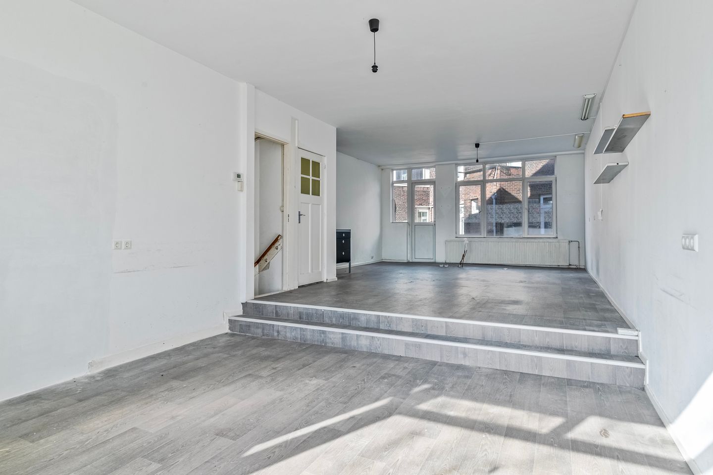 Entree, bij binnenkomst in de woning betreedt u direct het lage gedeelte van de woonkamer. Dit deel loopt naadloos over in het hoofdgedeelte van de woonkamer, dat op een podiumverhoging ligt. Met een royale oppervlakte en grote raampartijen aan weerszijden, heeft de woonkamer een prettige lichtinval. De ruimte biedt volop mogelijkheden voor het creëren van een comfortabele zithoek en een apart eetgedeelte. Aan de achterzijde bevindt zich een handige pantry/eenvoudig keukenblok voor koffie- en theemogelijkheden. Separaat bevindt zich de toiletruimte. Via de achterzijde van de woonkamer is er toegang tot een balkon, gelegen op het noorden.