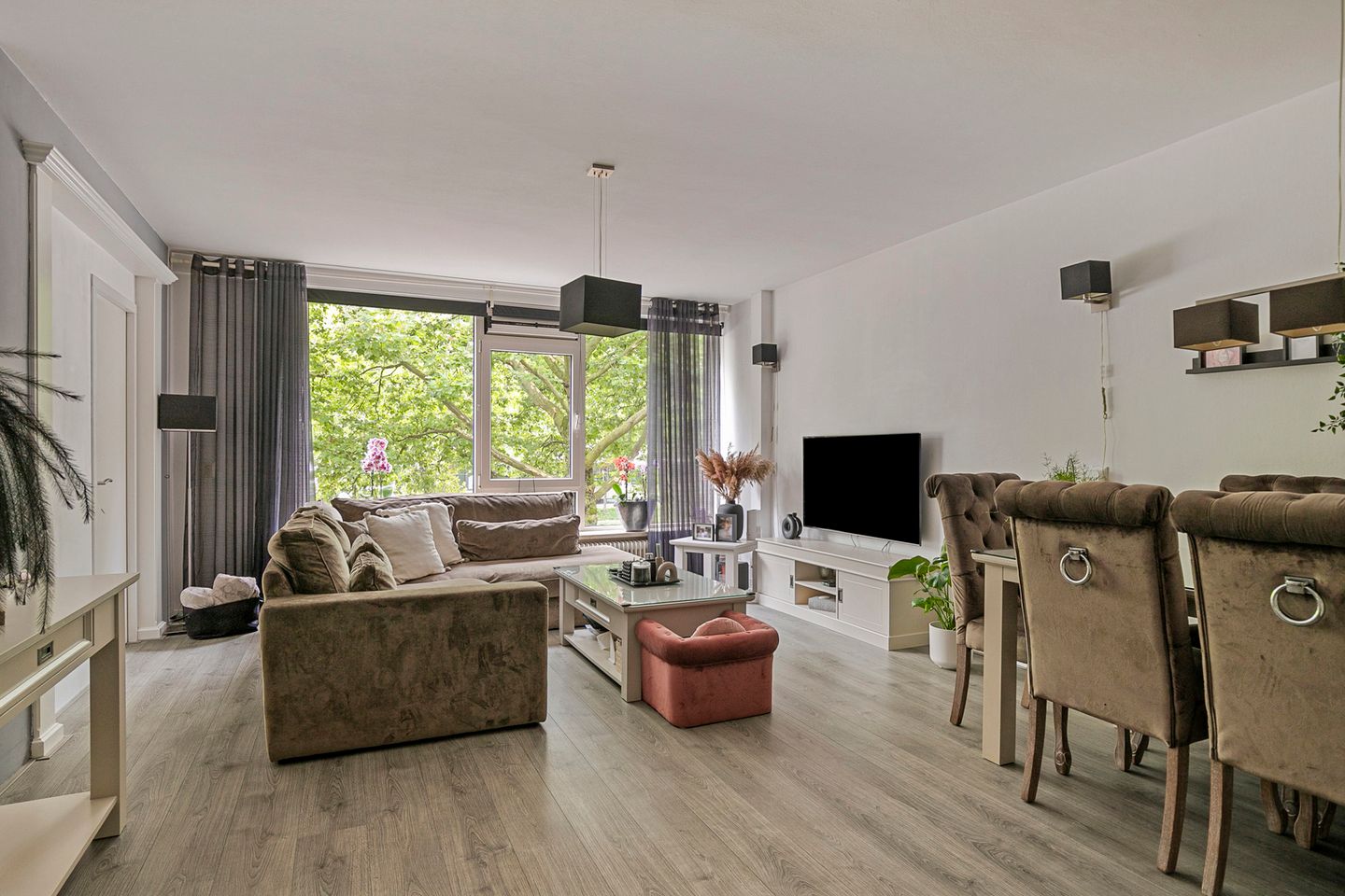 Entree, hal met toegang tot alle vertrekken. Ruime woonkamer voorzien van een laminaatvloer. Door de grote raampartijen is er veel lichtinval in de woonkamer. De moderne keuken bevindt zich aan de galerijzijde en is uitgevoerd met diverse inbouwapparatuur, zoals inductiekookplaat, afzuigkap, vaatwasser en oven. De hoofdslaapkamer is gelegen aan de voorzijde van de woning en geeft toegang tot het balkon. Daarnaast zijn er nog twee slaapkamers aan de galerijzijde van de woning.