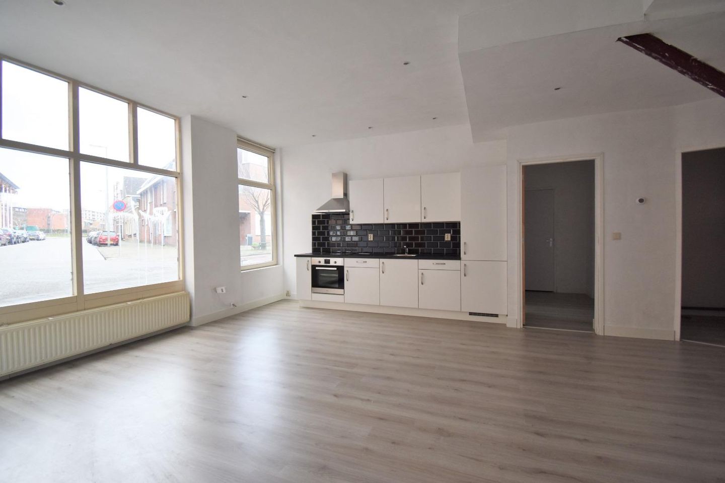 Entree, hal met meterkast geeft toegang tot de woonkamer met open keuken. Aan de voorzijde van de woning is de woonkamer gesitueerd, welke is voorzien hoge raampartijen met veel lichtinval. De open keuken is uitgerust met diverse onder- en bovenkasten en inbouwapparatuur zoals 4 zones inductiekookplaat, afzuigkap, koel-vriescombinatie en een oven. Vanuit de woonkamer is er toegang tot de wasruimte/stookruimte, waarin ook de aansluiting voor de wasmachine en de cv-combiketel zich bevindt. Aan de achterzijde van de woning is de slaapkamer van ca. 9 m² gesitueerd, voorzien van een nette laminaatvloer. De moderne badkamer is voorzien van een inloopdouche en een dubbel wastafelmeubel met spiegel. Separaat bevindt zich de toiletruimte.