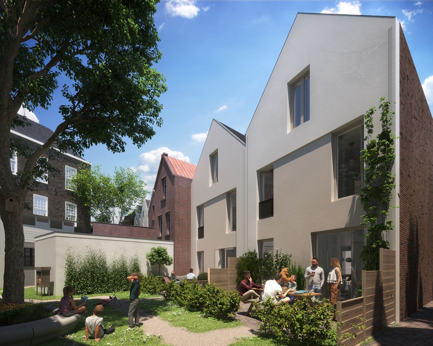Elke woning heeft een eigen tuin, die direct grenst aan een gezellig pleintje. Dit biedt niet alleen een fijne plek voor ontspanning, maar ook privacy, terwijl je vanuit je tuin de spelende kinderen op het pleintje kunt zien.
