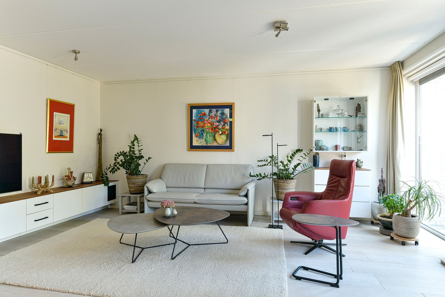 Lichte woonkamer (ca. 8.16 x 5.40m) met openslaande deur naar de tuin, plavuizenvloer met vloerverwarming en trapkast.