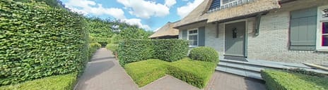 De tuin is ontworpen door een tuinarchitect en ligt als een groen park rondom de woning. Aan de voorzijde springen de gebakken klinkers, strak gesnoeide wolken en de leilindes meteen in het oog. Overal is sfeerverlichting en alles aangesloten op het domoticasysteem. Bij een alarm springt de buitenverlichting automatisch aan.