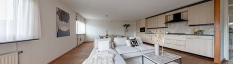 De ruime woonkamer heeft veel ramen, waardoor je geniet van een fijne lichtinval. Vanuit hier loop je zo door naar de loggia, een heerlijke plek om van het buitenleven te genieten. De open keuken is praktisch ingericht en biedt alles wat je nodig hebt om uitgebreid te koken.