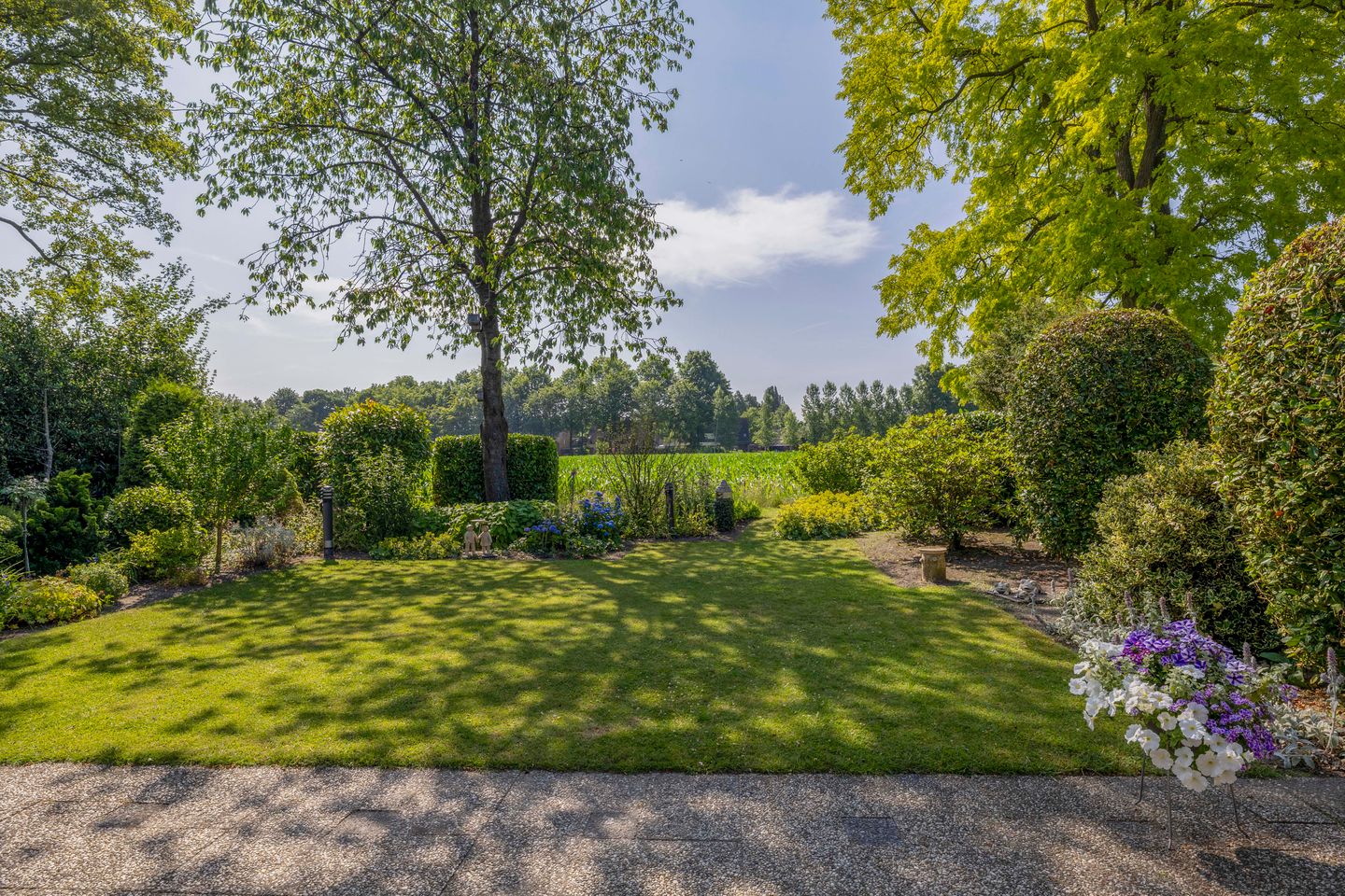 De woning beschikt over een ruime voortuin en een royale achtertuin. De voortuin is aangelegd met veel groene, vaste beplanting en aan de linkerzijde kunt u twee auto's op eigen terrein parkeren, waarvan één onder de carport (voorzien van een grote lichtkoepel). De achtertuin is aangelegd met een stenen terras, groot gazon, bomen en diverse volwassen beplanting. Doordat de achterzijde grenst aan het buitengebied, kunt u heerlijk tot rust komen en genieten van veel privacy.