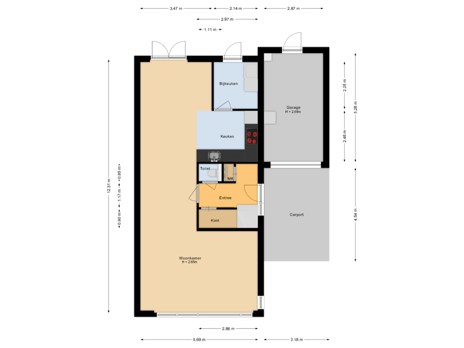 - 114 m² (11,00 meter diep en 10,40 meter breed)