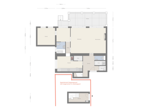 De ruime woon- eetkamer ( 7.4 x 5.37 m) heeft over de volledige breedte een terras.