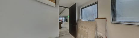 Het unieke pand is te betreden middels de voordeur met raampartijen. Hierdoor heb je een ruime en lichte inkom met genoeg ruimte voor een garderobe. Ook is hier plaats gemaakt voor de uitgebreide meterkast. Rechts stappen we eerst de badkamer binnen. En wat een prachtig begin van de rondleiding is dit. Deze ruimte is erg ruim van opzet en biedt plaats voor twee wastafels, een toilet, een handdoekradiator en achter de wand wacht een leuke verrassing: twee douches én een Sunshower! Vervolgens gaan we verder naar de royale woonkamer. Hier valt ook direct de strakke afwerking op en de grote vloertegels van maar liefst 1,2 x 1,2 meter! Dat zie je niet vaak. Er is alle ruimte voor een gezellige zithoek en een lange eettafel. De keuken is toch wel echt dé eyecatcher. Het royale kookeiland biedt genoeg plaats om meerdere barkrukken aan te zetten en verder is de keuken voorzien van inductie (Bora), een Quooker, vaatwasser, koelkast, vrieskast, een ingebouwde koffiemachine, een waterdamp oven en een combioven. Tenslotte wordt de aanbouw betreden. Deze kan gebruikt worden als slaapkamer, waardoor gelijkvloers leven mogelijk wordt gemaakt. Uiteraard kan je het ook inzetten als kantoor/salon, hobbyruimte of speelkamer voor de kinderen. Middels de vlizotrap wordt de ruimte boven de aanbouw betreden. Deze ruimte is ook nog groter dan je zou denken en kan zelfs mogelijk als extra slaapkamer worden gebruikt (hiervoor zal je wel even een vaste trap moeten zetten).