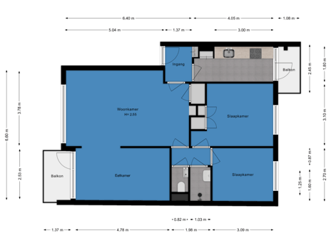 Je komt binnen in de hal, waar de meterkast zich bevindt, rechtdoor is de deur naar de keuken maar eerst gaan we naar rechts, de deur naar de woonkamer en de aangrenzende open eetkamer. De keurige laminaatvloer loopt drempelloos door het gehele appartement. De woonkamer is een heerlijke lichte ruimte met grote ramen aan de voorzijde, op het Zuiden. Links in de woonkamer is de deur naar het eerste balkon, waar je al vroeg kunt genieten van het zonnetje. Van hieruit kijk je tussen de huizen door naar nog meer water en groen. Wat een uitzicht. Prima plek voor een buitenontbijtje, een boek of ’s avonds met een drankje en een zak chips op schoot. Heerlijk toch? Gaan we nu naar de keuken, deze ligt aan de achterzijde en vandaaruit kom je op het tweede balkon. Lekker als het ´s zomers een beetje te warm wordt. De keuken is netjes en heeft een gaskookplaat en door de bovenkastjes over de gehele lengte is er genoeg ruimte voor alle potten, pannen en voorraden.