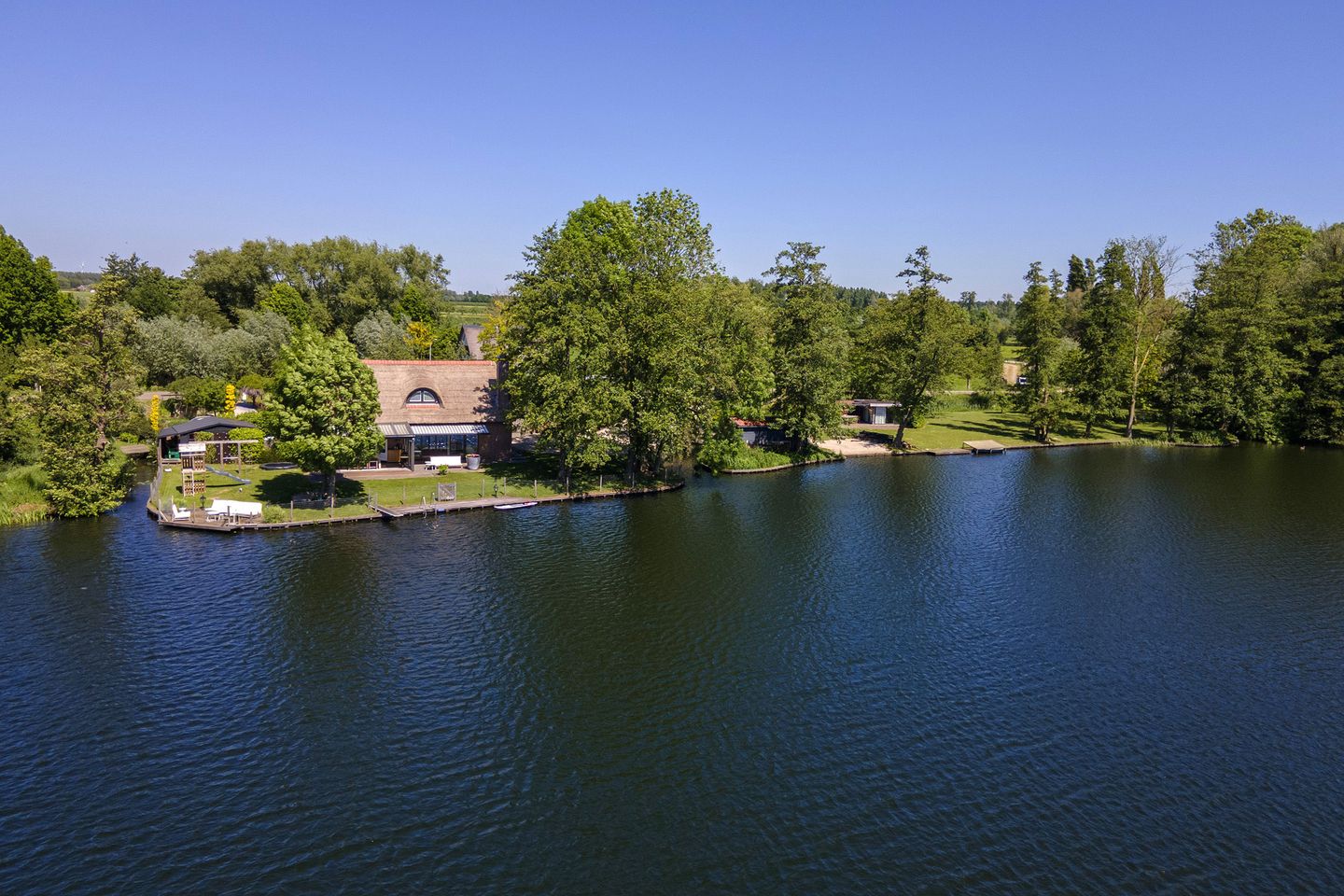 Op een royaal perceel van 3.355 m² eigen grond én water ligt deze stijlvolle, rietgedekte vrijstaande woning – een unieke plek waar rust, ruimte en comfort samenkomen. Met een privéstrandje, meerdere steigers (voor zwemmen, zonnen en aanleggen van een boot), een hottub en een luxe wellnessruimte, is dit een oase voor wie het leven buiten écht wil beleven. Alles ademt hier sfeer en modern comfort. Binnen is het warm, karaktervol en eigentijds – buiten is het eindeloos genieten van het uitzicht over het stille water, de weidse luchten en de omliggende natuur. Een plek waar het leven tot rust komt.