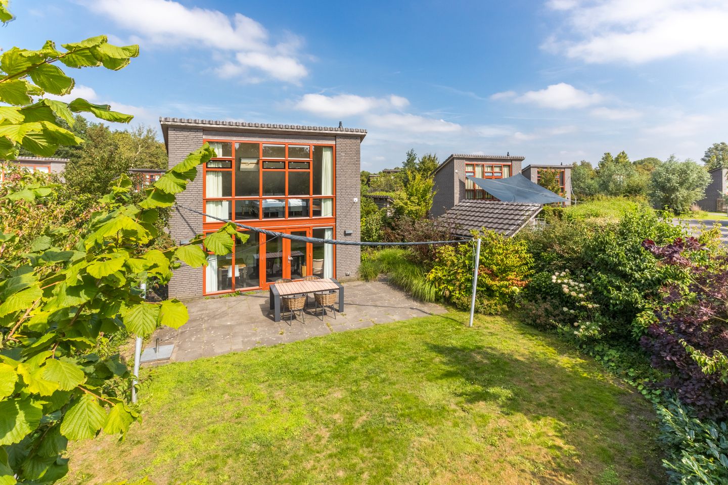 De riante en groene tuin geeft de woning een echt vakantiegevoel. Het beschikt over een groot betegeld terras, veel groene borders/boompjes en een groot grasveld.