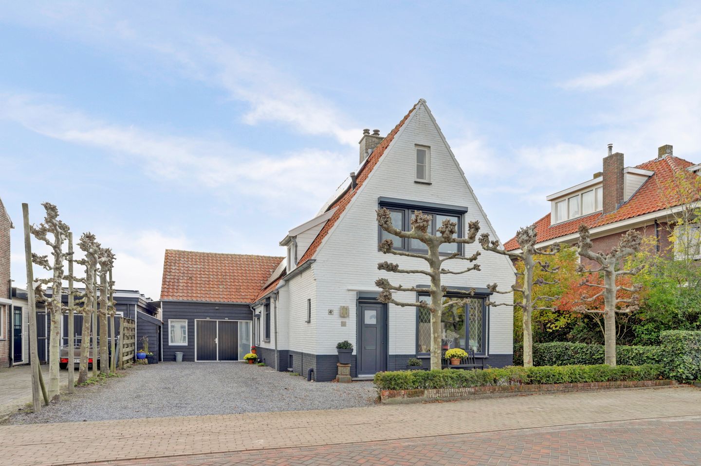 Bij aankomst valt direct de karakteristieke gevel op, met zijn fraaie lijnen, donkere kozijnen en rode dakpannen. Via de voordeur komt u binnen in de hal met trapopgang en toegang tot de keuken. De keuken is praktisch ingericht en voorzien van moderne apparatuur, waaronder een inductie kookplaat, afzuigkap, vaatwasser en kokend waterkraan. De donkere vloertegels geven de ruimte een moderne en onderhoudsvriendelijke uitstraling. De keuken staat in directe verbinding met de woonkamer, wat zorgt voor een fijne open leefruimte.