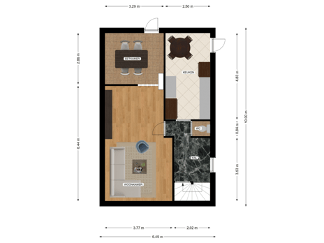 De woonkamer is groot ca. 6,5 x 3,4 m. en is voorzien van grote raampartijen met veel lichtinval en een massief parketvloer.